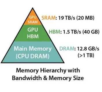 以 A100 为例:A100 GPU 有 40~80GB 的高带宽内存(HBM),带宽为 1.5-2.0 TB/s,而每 108 个流处理器有 192KB 的 SRAM,带宽估计在 19TB/s 左右。可以看到虽然 SRAM 容量小了很多,但是速度却提升了10倍,所以如何高效的利用 SRAM 是提速注意力算法的关键。